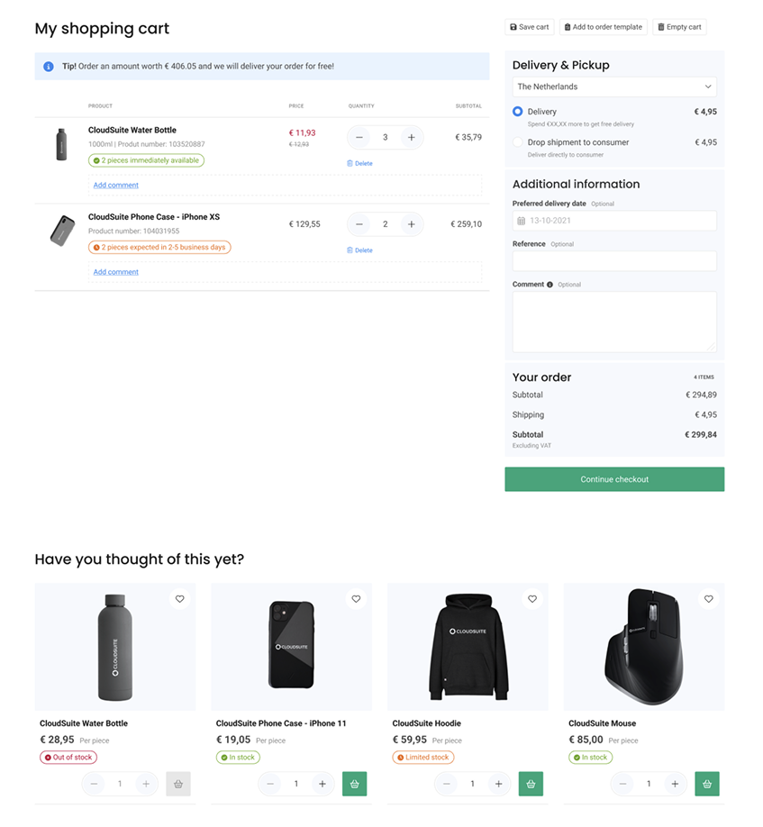 CloudSuite has various standard product tiles for various shop types. The product information and options that you can include also depend on the type of shop (B2B, B2C, and branch).