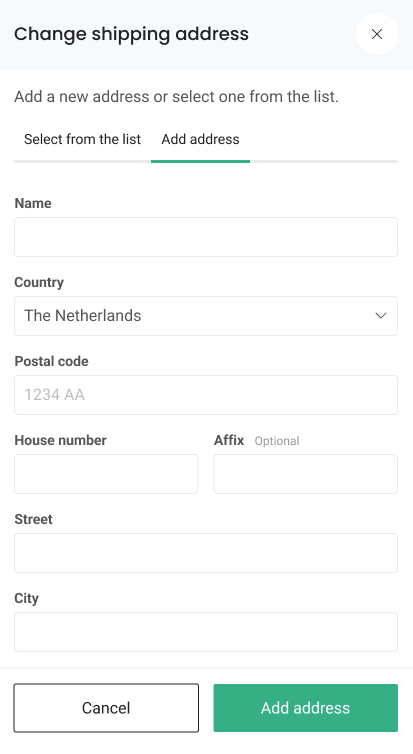 - Add delivery address opens a pop-up with a form to add a new delivery address