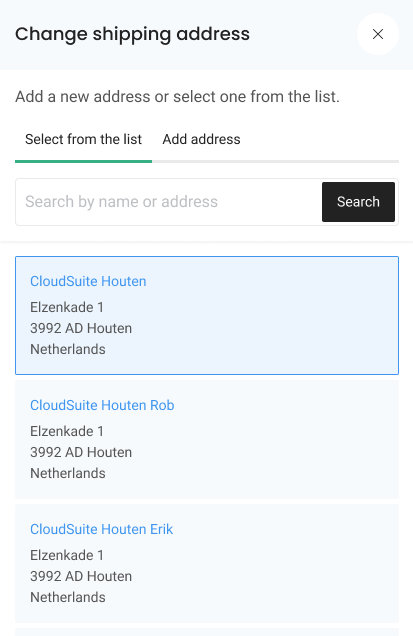 - Select delivery address opens a pop-up with a list of available addresses to select from