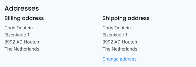 The Address section of the Payment Page lets the customer edit or add invoice and delivery addresses (based on the settings of the webshop).