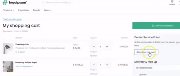 - Either the dealer places the order in the webshop or the (end) customer of the dealer places the order directly in the shop. By selecting a dealer, the order is automatically linked to the dealer service point during check out.