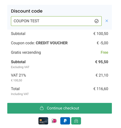 - Once the coupon is entered, the promotion is activated, and the discount is immediately visible in the basket. The discount only works if the basket contains (tagged) products from the selection promotion bundle.