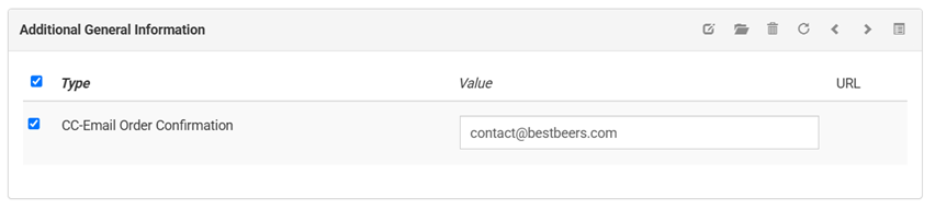 - As the Type, choose CC-Email Order Confirmation and under Value, enter the email address of the person who should receive a copy of the order confirmation.