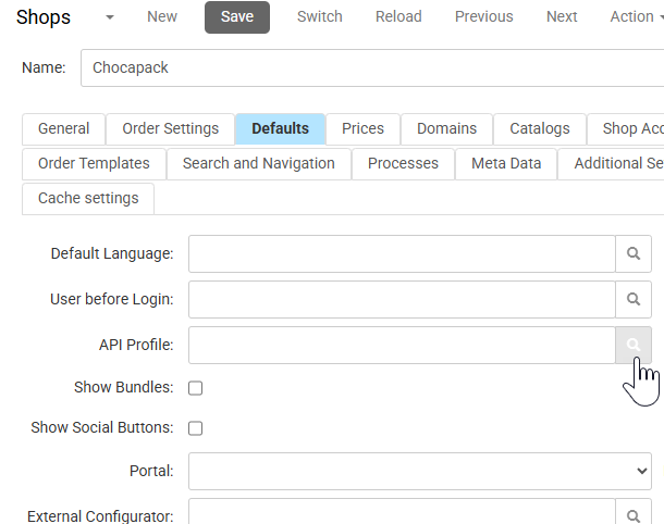 - In the shop details, go to the tab Defaults and click on magnifying glass icon next to API Profile.