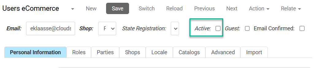 - In the CloudSuite App, go to Customers > Users eCommerce > Users and open the user.