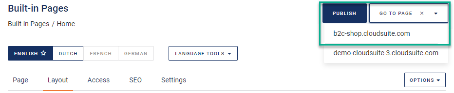 Until you publish your changes, they are not visible in the webshop. As soon as your changes have been saved, however, you can preview them in the test environment: click GO TO PAGE and select the test shop.