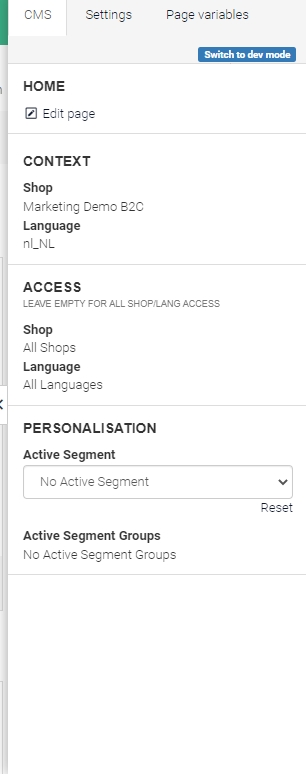 The sidebar's functionality is split over three tabs. In each of these, the button Switch to dev mode is visible, which lets you switch between 'live' mode and 'dev' mode: live mode displays the page as it would appear after publishing, while dev mode allows you to preview how your page appears on the front-end after saving but before publishing it. In dev mode, lines are drawn around the various content blocks so that you can easily see how the page is constructed: you can also inspect all the widgets used on the page to identify potential errors.