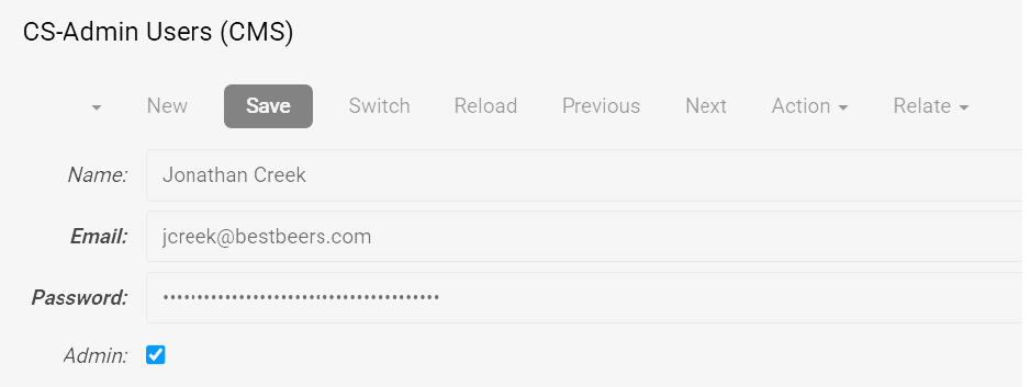 To work with CS Admin users, in the CloudSuite App go to Marketing > CS-Admin Users (CMS). An overview appears, listing all Admin users that have already been defined. Double-click an existing user to edit their details or click New to create a new one.