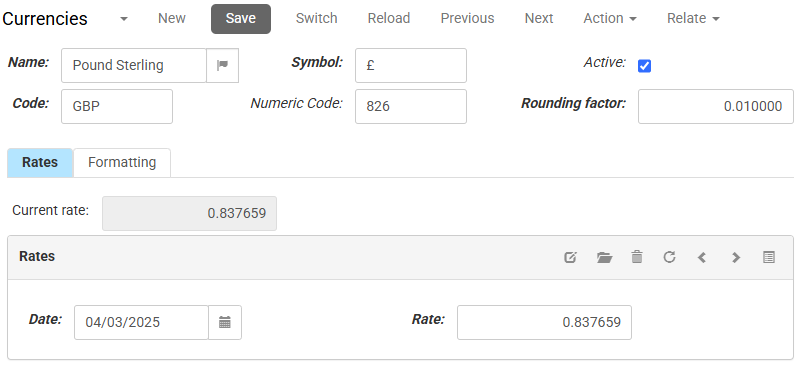The exchange rate for a particular currency can be used to convert product prices from one currency to another. This applies to both trade products and service products (such as shipping costs). Exchange rates are set to be valid from a particular date: next to Current rate today's rate is shown.