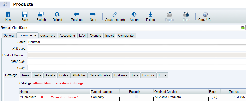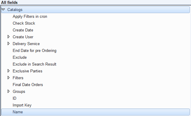 Many of the entries In the All Fields list are preceded with a right-pointing arrow head. This indicates that the main entry represents a combination of fields that can be itself configured, and therefore contains more information than is shown in the field in the record. For example, a product's Catalogs have their own configuration with different fields which also contain data that you can select for export (such as name, shops, ID, etc.).