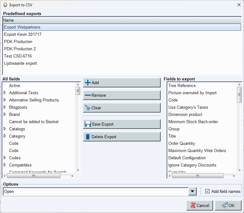 If one or more exports have already been saved (see below), these are listed under Predefined exports. Double-click the one you want to use: Under Fields to export, only the fields that are selected for export are shown. If these are what you want, you can click OK immediately to start the export.