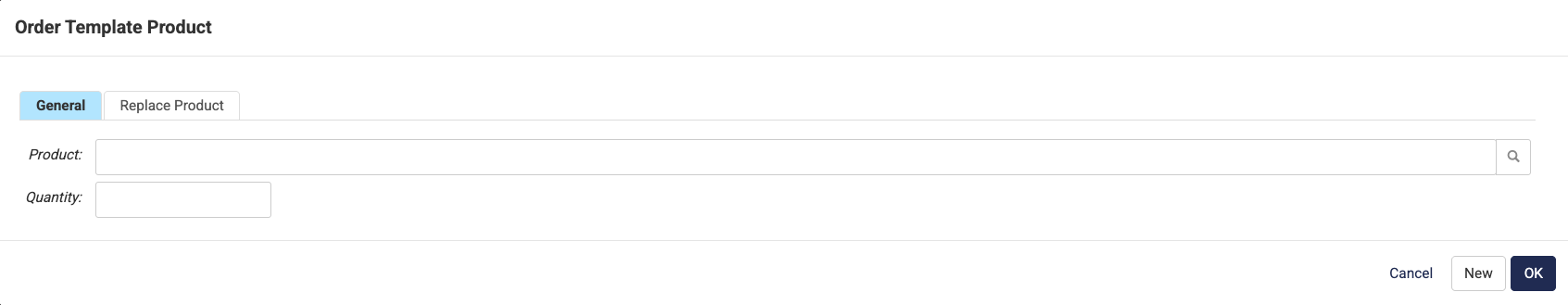 - Use the Replace Product tab to replace a different product that already belongs to the order template by the current one. The new product will replace the old one and a message can be shown to the customer in the order template.